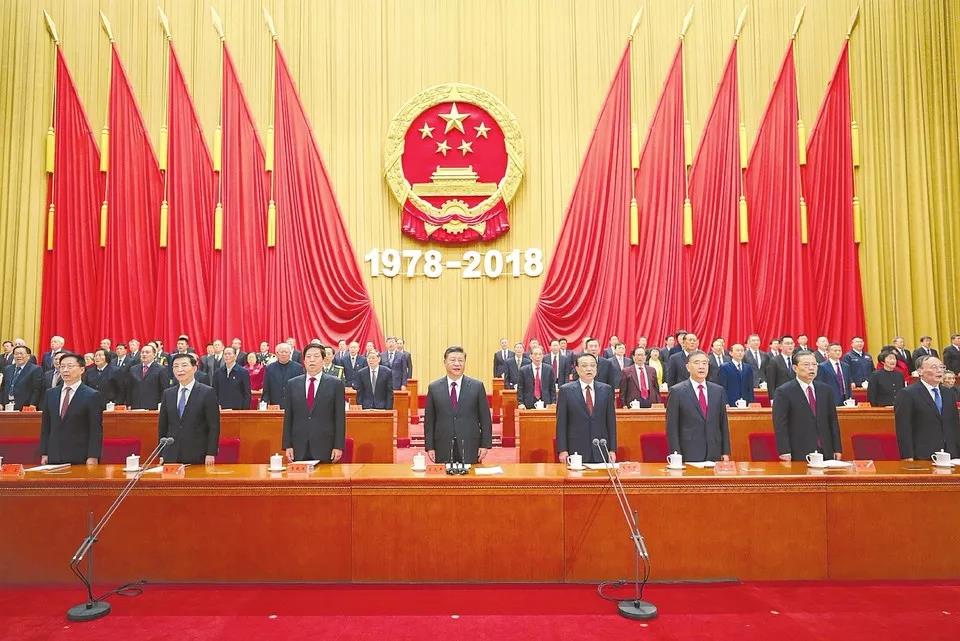 人民大會堂雄偉莊嚴,萬人大禮堂燈火輝煌、氣氛熱烈。主席臺上方懸掛著“慶祝改革開放40周年大會”會標,后幕正中是中華人民共和國國徽和“1978-2018”字標,10面紅旗分列兩側。