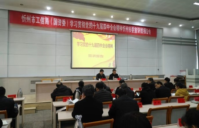 2019年11月26日上午,忻州市工信局(國資委)學(xué)習(xí)貫徹黨的十九屆四中全會(huì)精神忻州市委宣講團(tuán)報(bào)告會(huì)在忻州市委黨校召開。市統(tǒng)戰(zhàn)部常務(wù)副部長鄭慧明同志在報(bào)告會(huì)上作宣講,市工信局黨委書記、局長吳瑞峰主持會(huì)議,工信局黨員干部、各監(jiān)管企業(yè)班子成員共180余人到會(huì)。公司黨委副書記陳志平、黨委委員趙培宏、王明生、邢春生等領(lǐng)導(dǎo)班子成員及相關(guān)人員參加。