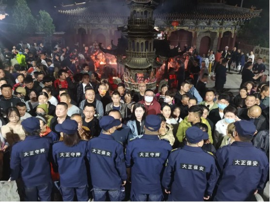 凌晨0點(diǎn)過后,車流量、人流量逐步增多,還愿、許愿香客絡(luò)繹不絕,執(zhí)勤隊(duì)員一邊要維持秩序,一邊還要檢查是否攜帶香火蠟燭燈等易燃物品進(jìn)入寺廟。凌晨0時(shí)直到次日中午12時(shí)在長達(dá) 24個小時(shí)的時(shí)間里,公司帶隊(duì)領(lǐng)導(dǎo)和隊(duì)員們始終堅(jiān)守在一線,充分體現(xiàn)了大正保安人紀(jì)律嚴(yán)明、吃苦耐勞、能打硬仗、團(tuán)結(jié)一致的優(yōu)良作風(fēng)。執(zhí)勤中,全體保安隊(duì)員堅(jiān)守崗位、履職盡責(zé)、文明執(zhí)勤,維持秩序、服務(wù)群眾,營造了安全祥和的氣氛,圓滿完成了此次廟會安;顒,展示了國企保安專業(yè)水準(zhǔn)和良好的精神風(fēng)貌。