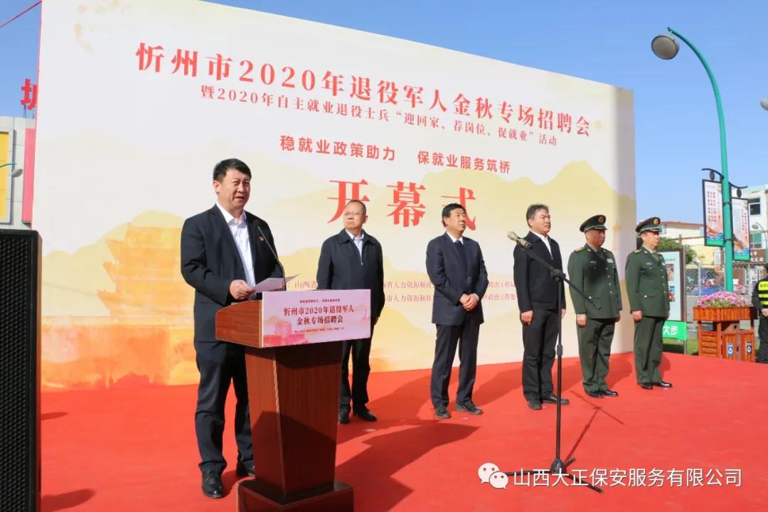 10月21日,由山西省退役軍人事務(wù)廳、山西省人力資源和社會(huì)保障廳、山西省軍區(qū)政治工作局主辦,忻州市退役軍人事務(wù)局、忻州市人力資源和社會(huì)保障局、山西省忻州軍分區(qū)承辦的忻州市2020年退役軍人金秋專場(chǎng)招聘會(huì)于忻州體育廣場(chǎng)舉行,活動(dòng)以“穩(wěn)就業(yè)政策助力,保就業(yè)服務(wù)筑橋”為主題。山西大正保安服務(wù)集團(tuán)有限公司總經(jīng)理趙培宏作為參會(huì)企業(yè)代表上臺(tái)發(fā)言,集團(tuán)公司人力資源中心工作人員在現(xiàn)場(chǎng)開展招聘活動(dòng)。